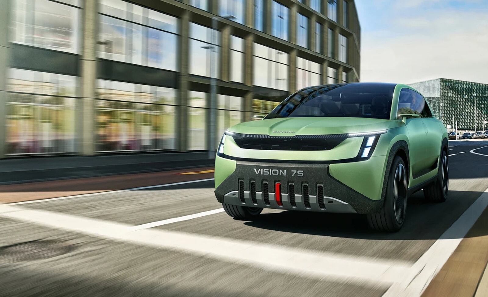 Het front van de Vision 7S valt meteen op door de bredere, vlakke grille in donkere, gesloten uitvoering en de opvallend ver naar de zijkant geplaatste koplampen, in twee rijen gestapeld met een T-vormige dagrijverlichting die zich uitstrekt in de uitgesproken spatborden. De scherp getekende motorkap volgt de klassieke Škoda-lijnen, terwijl de volledig vernieuwde bumper met zeven verticale luchtinlaten en een opvallende oranje inzet in het midden een stoere uitstraling geeft. De aluminium beschermplaat aan de onderzijde en de grote, aerodynamisch geoptimaliseerde wielen versterken de krachtige aanwezigheid van de Vision 7S. Vanaf de zijkant vallen de heldere vlakken en de zacht aflopende daklijn naar achteren op, wat het silhouet elegant en dynamisch maakt.