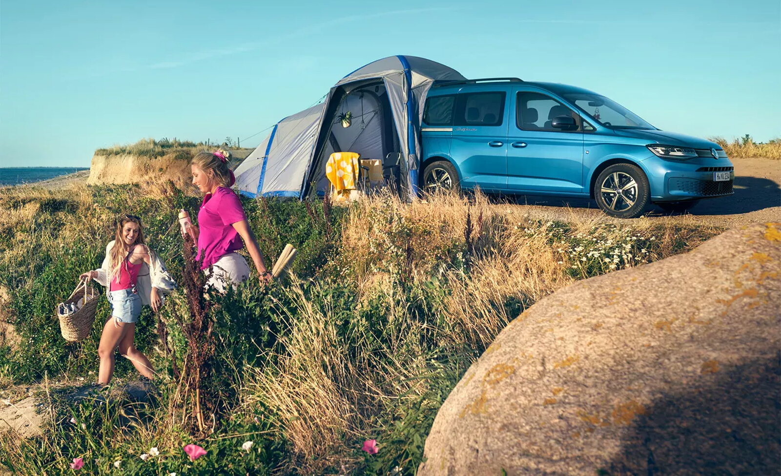 De geur van vers gezette koffie in de ochtendzon. Een snelle snack met uitzicht op zee. Of een warme maaltijd na een dag vol ontdekkingen. De compacte achterkeuken van de Caddy California staat altijd voor u klaar. Met een eenpits gasfornuis en praktische opbergruimte heeft u alles binnen handbereik. Open de achterklep en creëer een openluchtkeuken met een stahoogte van twee meter. En als u nog meer ruimte wilt, biedt de optionele tent een beschutte en knusse kookplek, perfect voor elke gelegenheid.